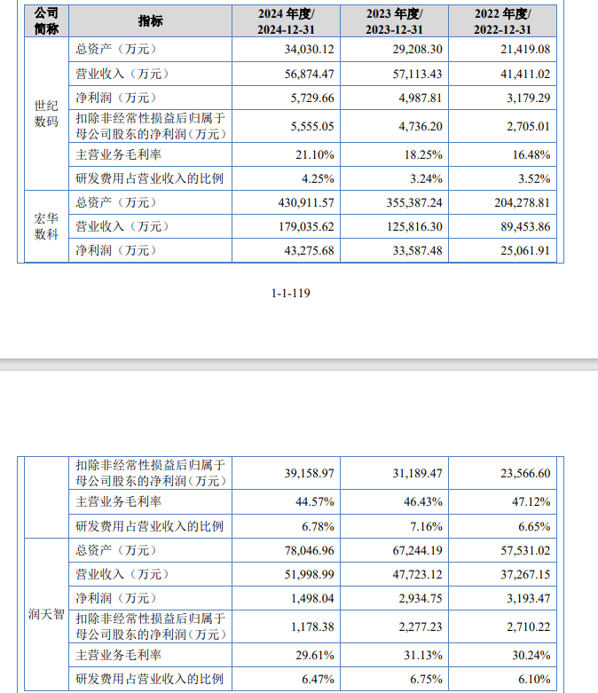 纵观2022至2024年,公司研发费用分别为1456.36万元、1848.65万元和2419.99万元,占营收占比分别是3.52%、3.24%和 4.25%。而同期可比公司——宏华数科(688789.SH)和润天智(832246.NQ)的研发费用占比均在为6%以上,世纪数码的研发投入水平长期低于行业均值。